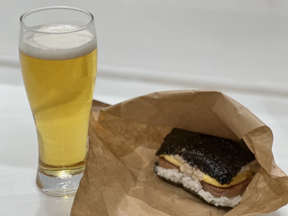 ラウンジでビール飲みながら石垣島で買ったポーク玉子おにぎりとやまやのおにぎりを堪能しました。